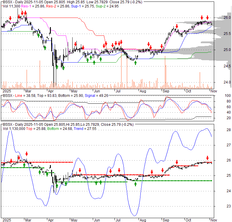 Price has closed below its short-term moving average. Short-term moving average is currently above mid-term; and above long-term moving average. From the relationship between price and moving averages: This stock is NEUTRAL in short-term; and BULLISH in mid-long term.[ BSSX ] has closed above bottom band by 14.6%. Bollinger Bands are 66.5% narrower than normal. The narrow width of the bands suggests low volatility as compared to its normal range. The bands have been in this narrow range for 3 bars. This is a sign that the market may be about to initiate a new trend.