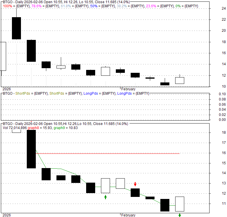 Price has closed above its short-term moving average. Short-term moving average is currently below mid-term; and below long-term moving average. From the relationship between price and moving averages: This stock is NEUTRAL in short-term; and NEUTRAL in mid-long term.[ BTGO ] has closed Bollinger Bands are 0% narrower than normal.