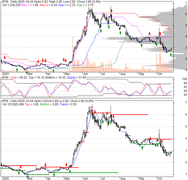 Price has closed above its short-term moving average. Short-term moving average is currently below mid-term; and below long-term moving average. From the relationship between price and moving averages: This stock is NEUTRAL in short-term; and BEARISH in mid-long term.[ BTM ] has closed above bottom band by 40.3%. Bollinger Bands are 14.6% wider than normal. The current width of the bands does not suggest anything about the future direction or movement of prices.
