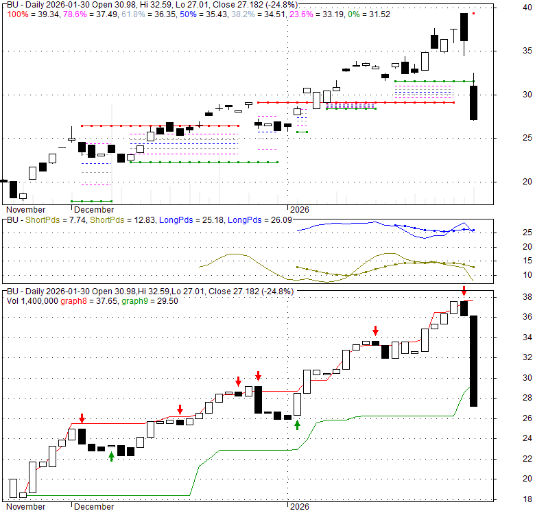 Price has closed below its short-term moving average. Short-term moving average is currently above mid-term; and below long-term moving average. From the relationship between price and moving averages: This stock is NEUTRAL in short-term; and NEUTRAL in mid-long term.[ BU ] has closed below the lower bollinger band by 14.2%. Although price has broken the lower band and a downside breakout is possible; the most likely direction for [ BU ] is to continue within current trading range. Bollinger Bands are 0% narrower than normal.