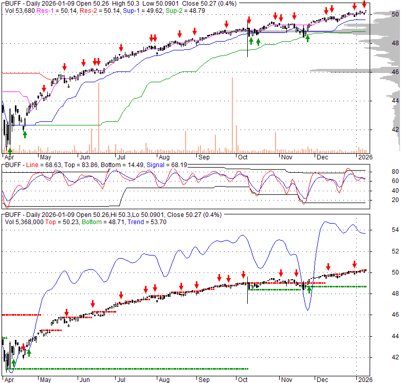 Price has closed above its short-term moving average. Short-term moving average is currently above mid-term; and above long-term moving average. From the relationship between price and moving averages: This stock is BULLISH in short-term; and BULLISH in mid-long term.[ BUFF ] has closed below upper band by 7.5%. Bollinger Bands are 15.4% narrower than normal. The current width of the bands does not suggest anything about the future direction or movement of prices.