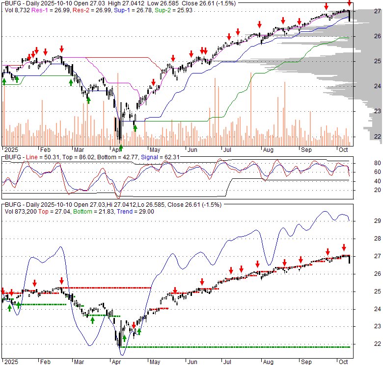 Price has closed below its short-term moving average. Short-term moving average is currently above mid-term; and above long-term moving average. From the relationship between price and moving averages: This stock is NEUTRAL in short-term; and BULLISH in mid-long term.[ BUFG ] has closed below the lower bollinger band by 10.5%. If price is in a downtrend band; this downward trend might continue. However a short term pullback inside the band is likely. Bollinger Bands are 30.3% narrower than normal. The current width of the bands does not suggest anything about the future direction or movement of prices.