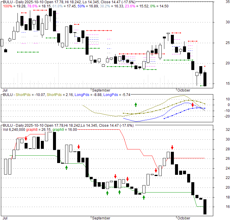 Price has closed below its short-term moving average. Short-term moving average is currently below mid-term; and below long-term moving average. From the relationship between price and moving averages: This stock is BEARISH in short-term; and NEUTRAL in mid-long term.[ BULU ] has closed below the lower bollinger band by 5.1%. Bollinger Bands are 0% narrower than normal.