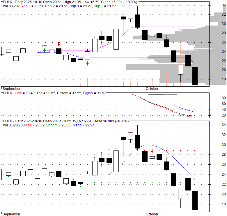 Price has closed below its short-term moving average. Short-term moving average is currently below mid-term; and below long-term moving average. From the relationship between price and moving averages: This stock is NEUTRAL in short-term; and NEUTRAL in mid-long term.[ BULX ] has closed below the lower bollinger band by 5.4%. Bollinger Bands are 0% narrower than normal.