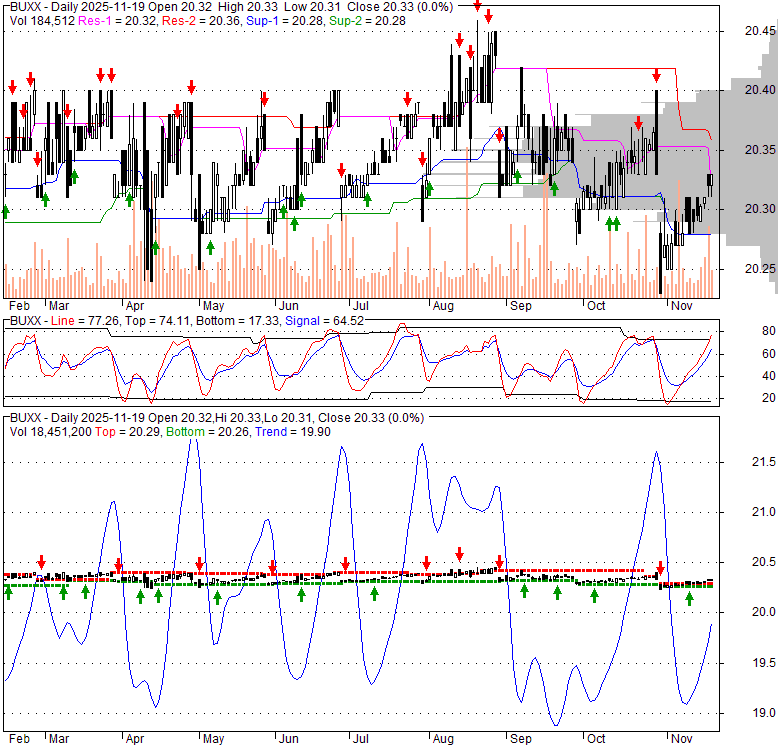Price has closed above its short-term moving average. Short-term moving average is currently below mid-term; and below long-term moving average. From the relationship between price and moving averages: This stock is NEUTRAL in short-term; and BEARISH in mid-long term.[ BUXX ] has closed below upper band by 3.1%. Bollinger Bands are 8.4% narrower than normal. The current width of the bands does not suggest anything about the future direction or movement of prices.