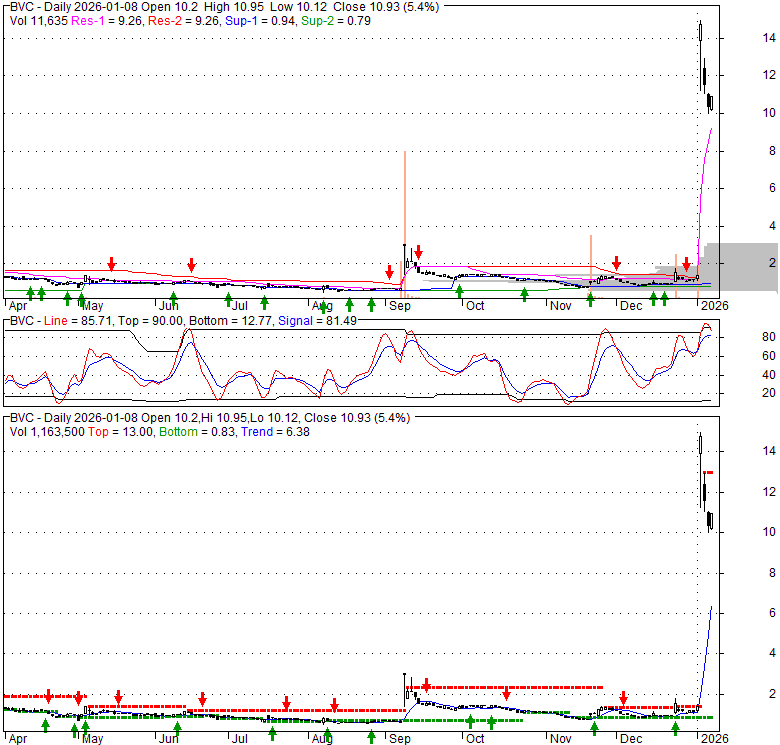 Price has closed above its short-term moving average. Short-term moving average is currently above mid-term; and above long-term moving average. From the relationship between price and moving averages: This stock is BULLISH in short-term; and BULLISH in mid-long term.[ BVC ] has closed below upper band by 14.3%. Bollinger Bands are 1238.4% wider than normal. The large width of the bands suggest high volatility as compared to its normal range. The bands have been in this wide range for 3 days. This is a sign that the current trend might continue.