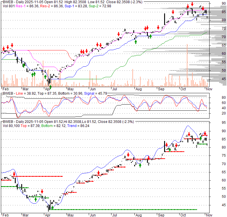 Price has closed below its short-term moving average. Short-term moving average is currently above mid-term; and above long-term moving average. From the relationship between price and moving averages: This stock is NEUTRAL in short-term; and BULLISH in mid-long term.[ BWEB ] has closed above bottom band by 22.6%. Bollinger Bands are 13.8% wider than normal. The current width of the bands does not suggest anything about the future direction or movement of prices.
