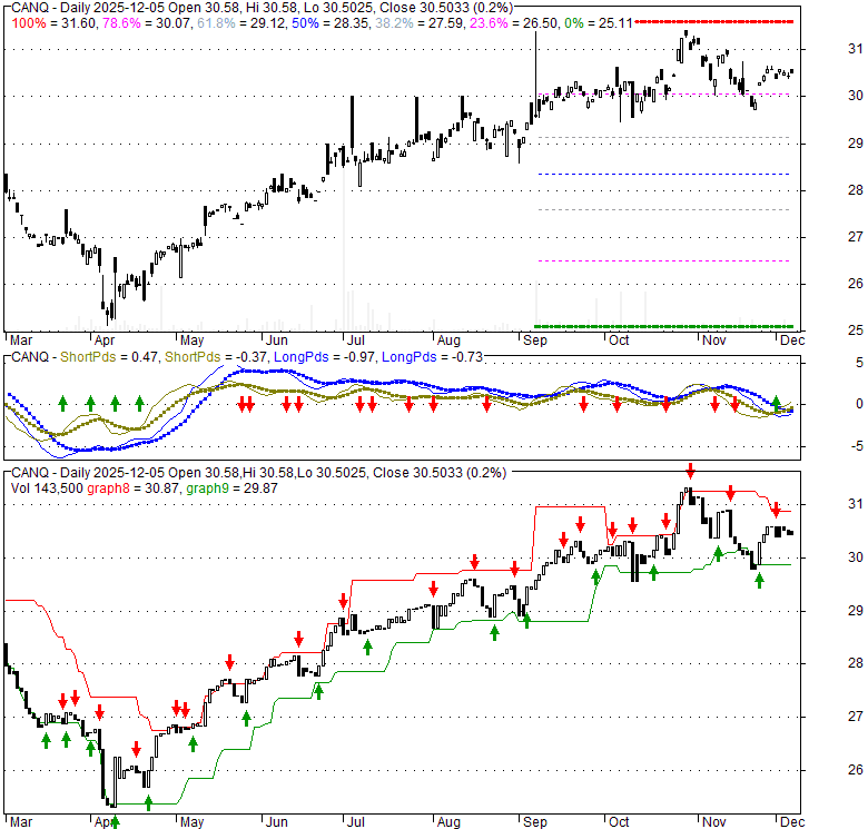 Price has closed above its short-term moving average. Short-term moving average is currently above mid-term; and above long-term moving average. From the relationship between price and moving averages: This stock is BULLISH in short-term; and BULLISH in mid-long term.[ CANQ ] has closed below upper band by 30.6%. Bollinger Bands are 0.4% wider than normal. The current width of the bands does not suggest anything about the future direction or movement of prices.