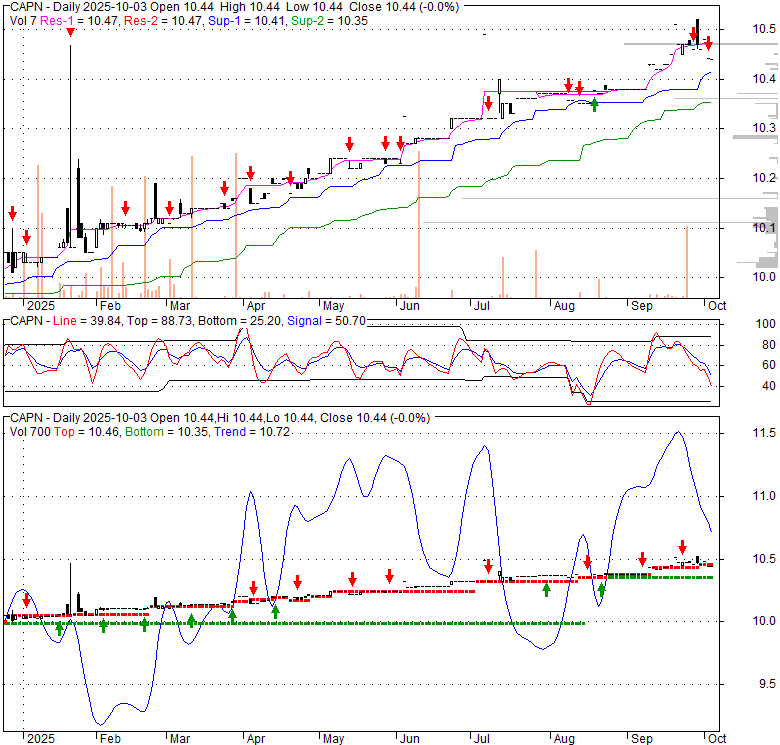 Price has closed below its short-term moving average. Short-term moving average is currently above mid-term; and above long-term moving average. From the relationship between price and moving averages: This stock is NEUTRAL in short-term; and BULLISH in mid-long term.[ CAPN ] has closed above bottom band by 26.6%. Bollinger Bands are 1.5% wider than normal. The current width of the bands does not suggest anything about the future direction or movement of prices.