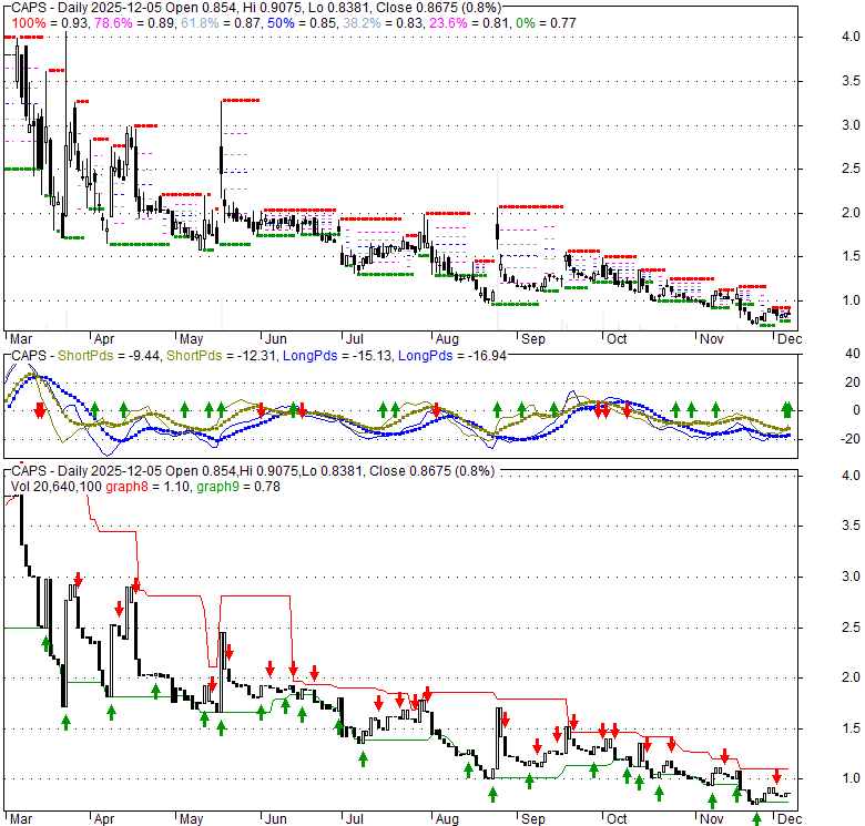 Price has closed above its short-term moving average. Short-term moving average is currently below mid-term; and below long-term moving average. From the relationship between price and moving averages: This stock is NEUTRAL in short-term; and BEARISH in mid-long term.[ CAPS ] has closed above bottom band by 49.1%. Bollinger Bands are 21.8% narrower than normal. The current width of the bands does not suggest anything about the future direction or movement of prices.