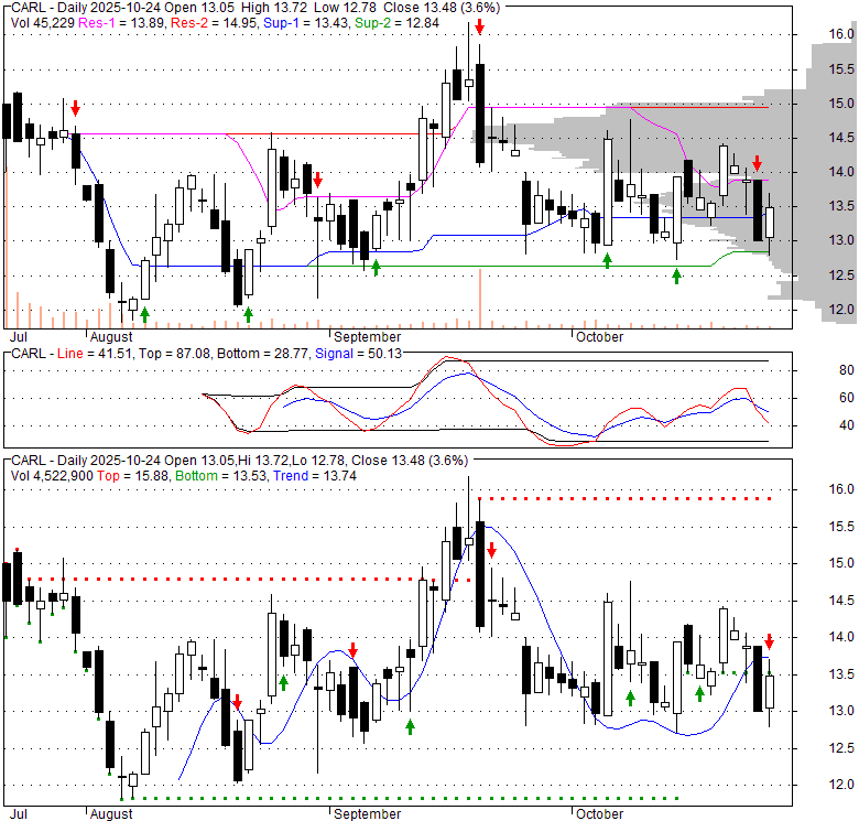 Price has closed below its short-term moving average. Short-term moving average is currently above mid-term; and below long-term moving average. From the relationship between price and moving averages: This stock is NEUTRAL in short-term; and NEUTRAL in mid-long term.[ CARL ] has closed above bottom band by 38.0%. Bollinger Bands are 0% narrower than normal.