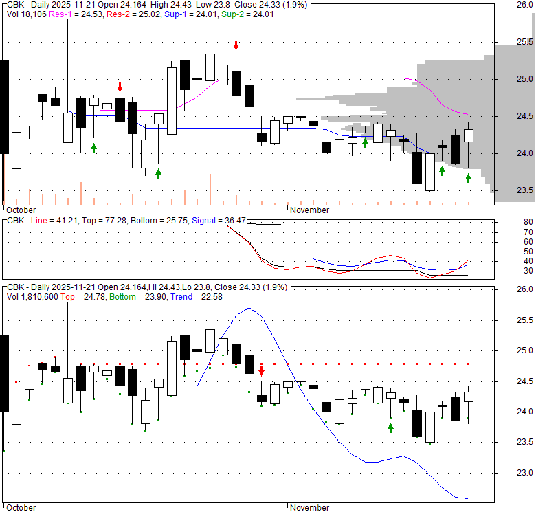 Price has closed above its short-term moving average. Short-term moving average is currently below mid-term; and below long-term moving average. From the relationship between price and moving averages: This stock is NEUTRAL in short-term; and NEUTRAL in mid-long term.[ CBK ] has closed below upper band by 36.8%. Bollinger Bands are 0% narrower than normal.