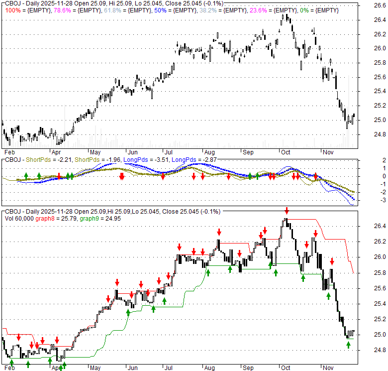 Price has closed above its short-term moving average. Short-term moving average is currently below mid-term; and below long-term moving average. From the relationship between price and moving averages: This stock is NEUTRAL in short-term; and BEARISH in mid-long term.[ CBOJ ] has closed above bottom band by 29.7%. Bollinger Bands are 101.8% wider than normal. The large width of the bands suggest high volatility as compared to its normal range. The bands have been in this wide range for 16 days. This is a sign that the current trend might continue.