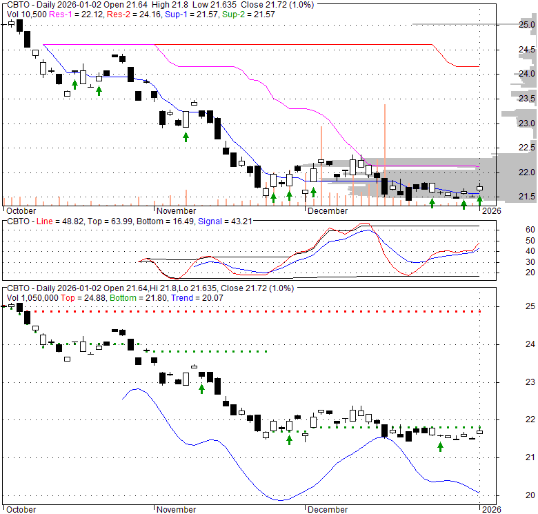 Price has closed above its short-term moving average. Short-term moving average is currently below mid-term; and below long-term moving average. From the relationship between price and moving averages: This stock is NEUTRAL in short-term; and NEUTRAL in mid-long term.[ CBTO ] has closed below upper band by 41.9%. Bollinger Bands are 0% narrower than normal.