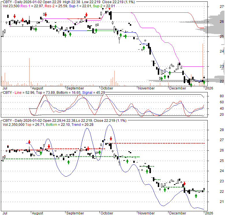 Price has closed above its short-term moving average. Short-term moving average is currently below mid-term; and below long-term moving average. From the relationship between price and moving averages: This stock is NEUTRAL in short-term; and BEARISH in mid-long term.[ CBTY ] has closed below upper band by 40.2%. Bollinger Bands are 37.1% narrower than normal. The current width of the bands does not suggest anything about the future direction or movement of prices.