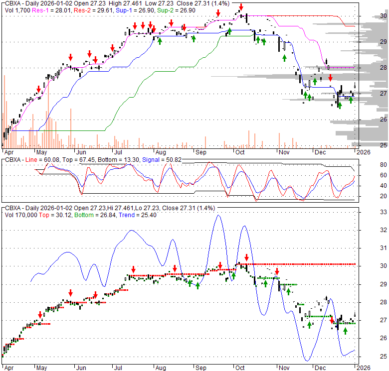 Price has closed above its short-term moving average. Short-term moving average is currently below mid-term; and below long-term moving average. From the relationship between price and moving averages: This stock is NEUTRAL in short-term; and BEARISH in mid-long term.[ CBXA ] has closed below upper band by 28.7%. Bollinger Bands are 5.8% wider than normal. The current width of the bands does not suggest anything about the future direction or movement of prices.
