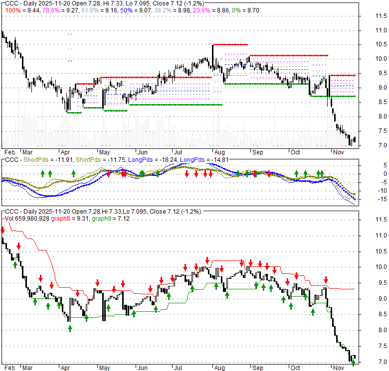 Price has closed below its short-term moving average. Short-term moving average is currently below mid-term; and below long-term moving average. From the relationship between price and moving averages: This stock is BEARISH in short-term; and BEARISH in mid-long term.[ CCC ] has closed above bottom band by 24.4%. Bollinger Bands are 108.2% wider than normal. The large width of the bands suggest high volatility as compared to its normal range. The bands have been in this wide range for 13 days. This is a sign that the current trend might continue.
