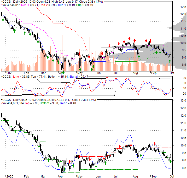 Price has closed above its short-term moving average. Short-term moving average is currently below mid-term; and below long-term moving average. From the relationship between price and moving averages: This stock is NEUTRAL in short-term; and NEUTRAL in mid-long term.[ CCCS ] has closed above bottom band by 50.0%. Bollinger Bands are 12.2% wider than normal. The current width of the bands does not suggest anything about the future direction or movement of prices.