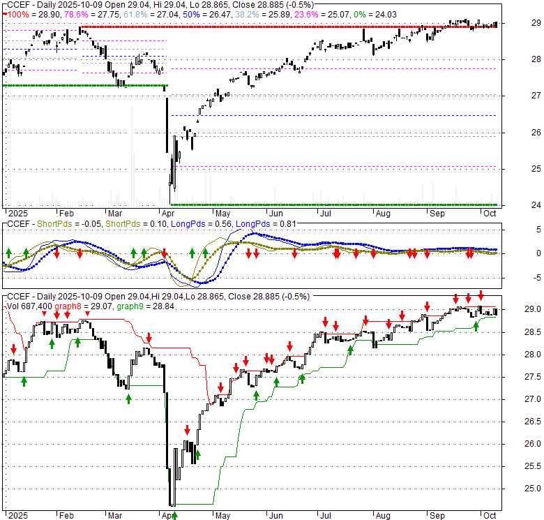 Price has closed below its short-term moving average. Short-term moving average is currently above mid-term; and above long-term moving average. From the relationship between price and moving averages: This stock is NEUTRAL in short-term; and BULLISH in mid-long term.[ CCEF ] has closed above bottom band by 27.3%. Bollinger Bands are 46.4% narrower than normal. The narrow width of the bands suggests low volatility as compared to its normal range. The bands have been in this narrow range for 9 bars. This is a sign that the market may be about to initiate a new trend.