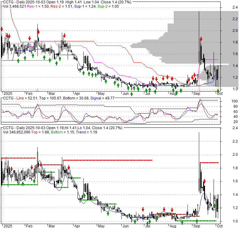 Price has closed above its short-term moving average. Short-term moving average is currently above mid-term; and above long-term moving average. From the relationship between price and moving averages: This stock is BULLISH in short-term; and BULLISH in mid-long term.[ CCTG ] has closed below upper band by 26.5%. Bollinger Bands are 71.3% wider than normal. The large width of the bands suggest high volatility as compared to its normal range. The bands have been in this wide range for 17 days. This is a sign that the current trend might continue.