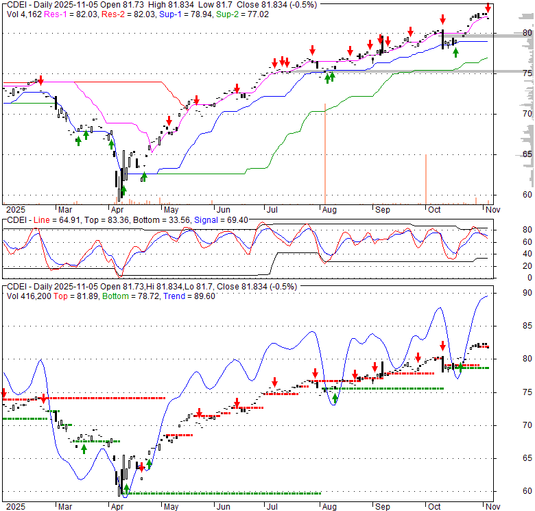 Price has closed below its short-term moving average. Short-term moving average is currently above mid-term; and above long-term moving average. From the relationship between price and moving averages: This stock is NEUTRAL in short-term; and BULLISH in mid-long term.[ CDEI ] has closed below upper band by 31.9%. Bollinger Bands are 74.9% wider than normal. The large width of the bands suggest high volatility as compared to its normal range. The bands have been in this wide range for 7 days. This is a sign that the current trend might continue.