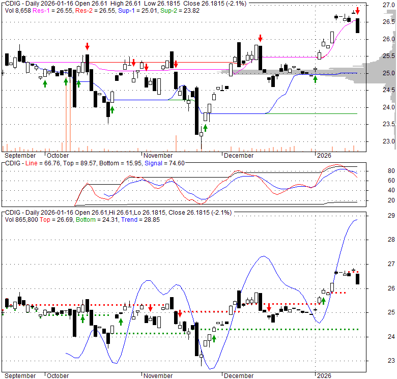 Price has closed below its short-term moving average. Short-term moving average is currently above mid-term; and below long-term moving average. From the relationship between price and moving averages: This stock is NEUTRAL in short-term; and NEUTRAL in mid-long term.[ CDIG ] has closed below upper band by 38.5%. Bollinger Bands are 0% narrower than normal.