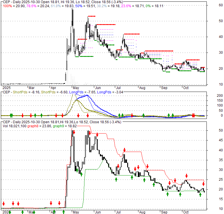 Price has closed below its short-term moving average. Short-term moving average is currently below mid-term; and below long-term moving average. From the relationship between price and moving averages: This stock is BEARISH in short-term; and BEARISH in mid-long term.[ CEP ] has closed above bottom band by 9.2%. Bollinger Bands are 59.1% narrower than normal. The narrow width of the bands suggests low volatility as compared to its normal range. The bands have been in this narrow range for 2 bars. This is a sign that the market may be about to initiate a new trend.