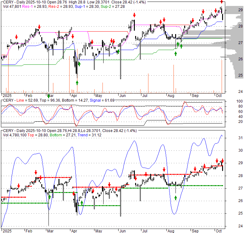 Price has closed below its short-term moving average. Short-term moving average is currently above mid-term; and above long-term moving average. From the relationship between price and moving averages: This stock is NEUTRAL in short-term; and BULLISH in mid-long term.[ CERY ] has closed above bottom band by 18.7%. Bollinger Bands are 17.5% narrower than normal. The current width of the bands does not suggest anything about the future direction or movement of prices.
