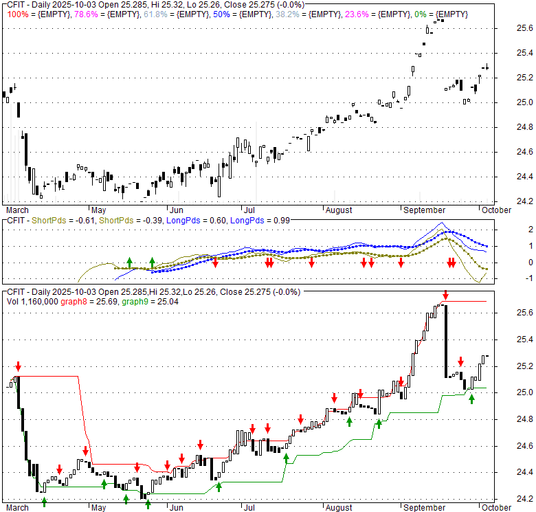 Price has closed above its short-term moving average. Short-term moving average is currently above mid-term; and above long-term moving average. From the relationship between price and moving averages: This stock is BULLISH in short-term; and BULLISH in mid-long term.[ CFIT ] has closed below upper band by 46.4%. Bollinger Bands are 116.6% wider than normal. The large width of the bands suggest high volatility as compared to its normal range. The bands have been in this wide range for {EMPTY} days. This is a sign that the current trend might continue.
