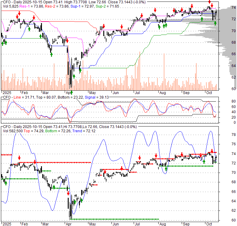 Price has closed above its short-term moving average. Short-term moving average is currently below mid-term; and above long-term moving average. From the relationship between price and moving averages: This stock is NEUTRAL in short-term; and NEUTRAL in mid-long term.[ CFO ] has closed above bottom band by 46.3%. Bollinger Bands are 11% wider than normal. The current width of the bands does not suggest anything about the future direction or movement of prices.