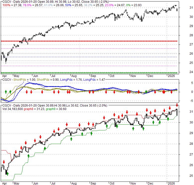 Price has closed below its short-term moving average. Short-term moving average is currently above mid-term; and above long-term moving average. From the relationship between price and moving averages: This stock is NEUTRAL in short-term; and BULLISH in mid-long term.[ CGCV ] has closed above bottom band by 25.1%. Bollinger Bands are 8.4% wider than normal. The current width of the bands does not suggest anything about the future direction or movement of prices.