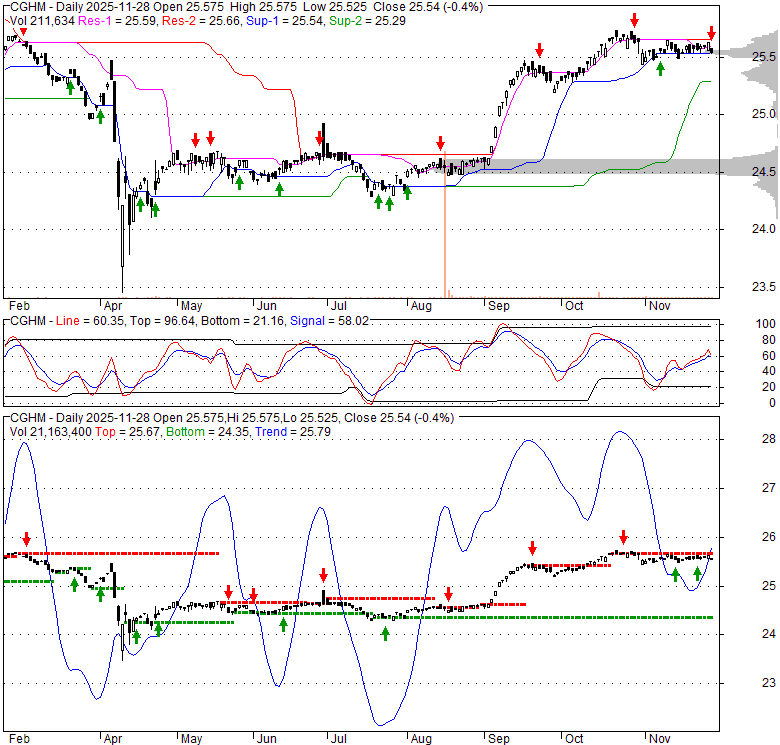 Price has closed below its short-term moving average. Short-term moving average is currently above mid-term; and above long-term moving average. From the relationship between price and moving averages: This stock is NEUTRAL in short-term; and BULLISH in mid-long term.[ CGHM ] has closed above bottom band by 30.4%. Bollinger Bands are 60.6% narrower than normal. The narrow width of the bands suggests low volatility as compared to its normal range. The bands have been in this narrow range for 8 bars. This is a sign that the market may be about to initiate a new trend.