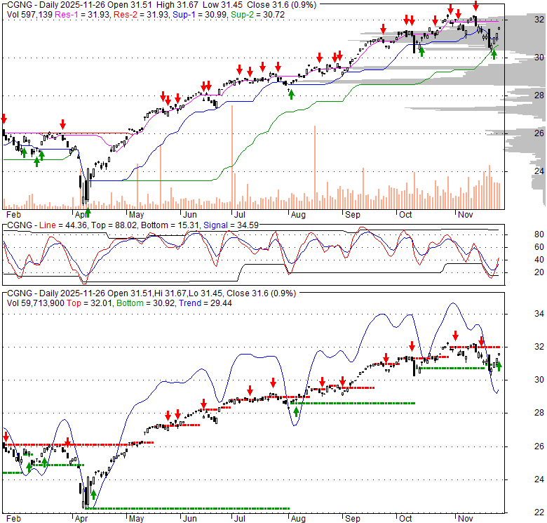 Price has closed above its short-term moving average. Short-term moving average is currently below mid-term; and above long-term moving average. From the relationship between price and moving averages: This stock is NEUTRAL in short-term; and NEUTRAL in mid-long term.[ CGNG ] has closed below upper band by 40.7%. Bollinger Bands are 50% wider than normal. The large width of the bands suggest high volatility as compared to its normal range. The bands have been in this wide range for 3 days. This is a sign that the current trend might continue.