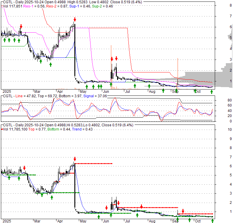 Price has closed above its short-term moving average. Short-term moving average is currently below mid-term; and below long-term moving average. From the relationship between price and moving averages: This stock is NEUTRAL in short-term; and BEARISH in mid-long term.[ CGTL ] has closed below upper band by 32.7%. Bollinger Bands are 75.8% narrower than normal. The narrow width of the bands suggests low volatility as compared to its normal range. The bands have been in this narrow range for 79 bars. This is a sign that the market may be about to initiate a new trend.
