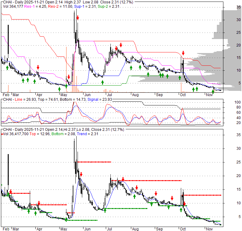 Price has closed above its short-term moving average. Short-term moving average is currently below mid-term; and below long-term moving average. From the relationship between price and moving averages: This stock is NEUTRAL in short-term; and BEARISH in mid-long term.[ CHAI ] has closed above bottom band by 25.0%. Bollinger Bands are 50.9% narrower than normal. The narrow width of the bands suggests low volatility as compared to its normal range. The bands have been in this narrow range for 19 bars. This is a sign that the market may be about to initiate a new trend.