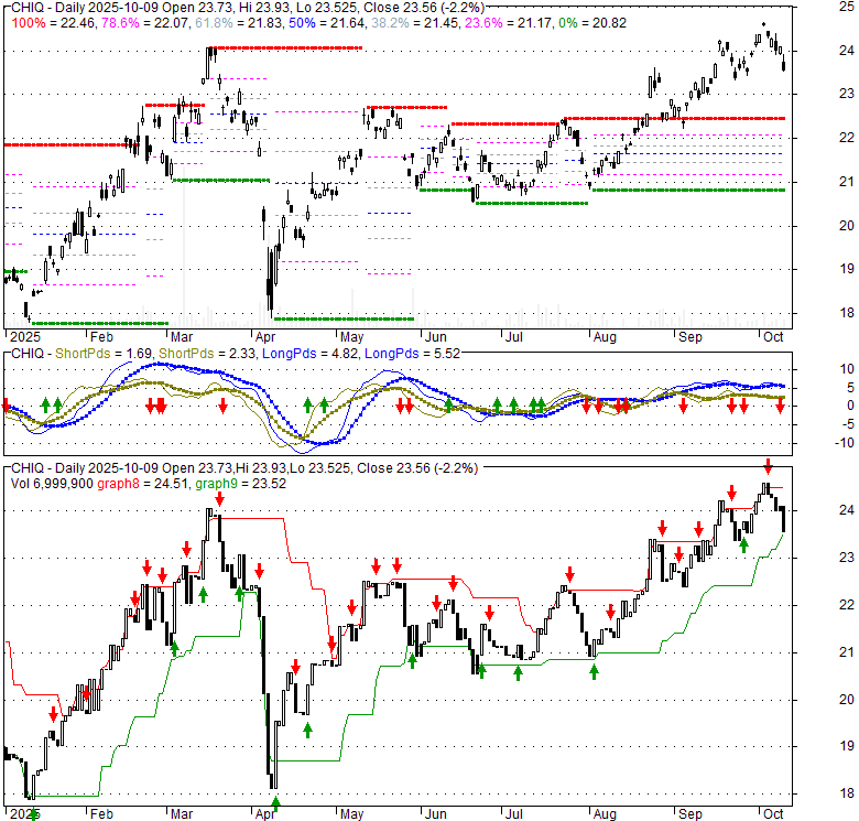 Price has closed below its short-term moving average. Short-term moving average is currently above mid-term; and above long-term moving average. From the relationship between price and moving averages: This stock is NEUTRAL in short-term; and BULLISH in mid-long term.[ CHIQ ] has closed above bottom band by 22.1%. Bollinger Bands are 20.6% narrower than normal. The current width of the bands does not suggest anything about the future direction or movement of prices.