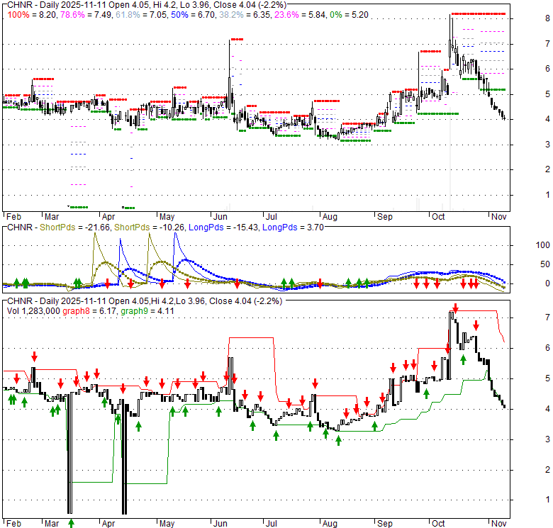 Price has closed below its short-term moving average. Short-term moving average is currently below mid-term; and below long-term moving average. From the relationship between price and moving averages: This stock is BEARISH in short-term; and NEUTRAL in mid-long term.[ CHNR ] has closed above bottom band by 14.0%. Bollinger Bands are 122.6% wider than normal. The large width of the bands suggest high volatility as compared to its normal range. The bands have been in this wide range for 21 days. This is a sign that the current trend might continue.