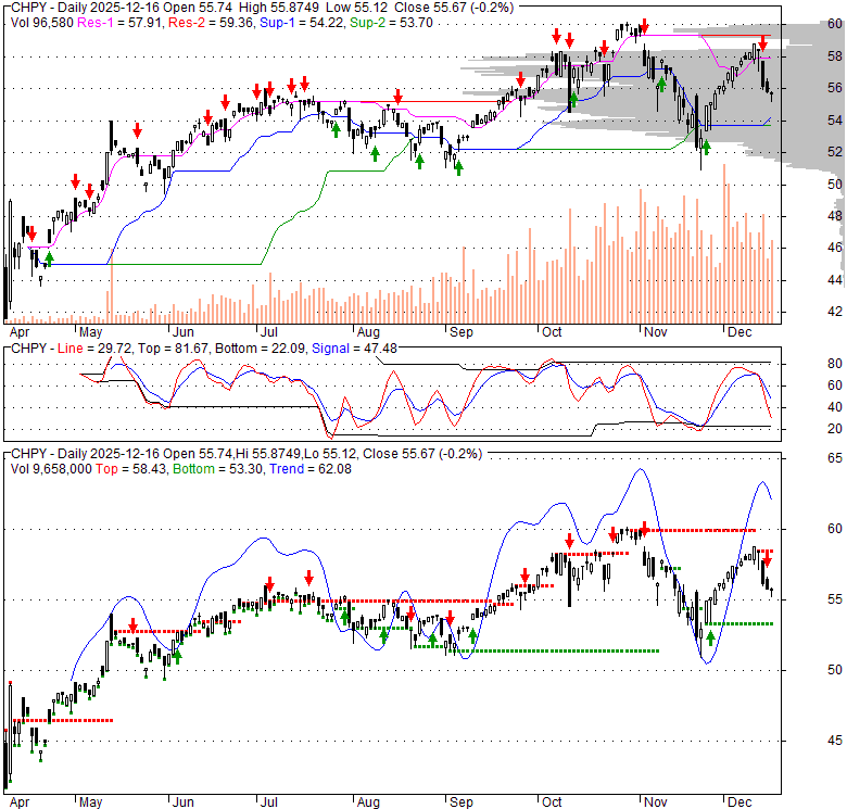 Price has closed below its short-term moving average. Short-term moving average is currently below mid-term; and above long-term moving average. From the relationship between price and moving averages: This stock is BEARISH in short-term; and NEUTRAL in mid-long term.[ CHPY ] has closed above bottom band by 22.7%. Bollinger Bands are 5.3% wider than normal. The current width of the bands does not suggest anything about the future direction or movement of prices.