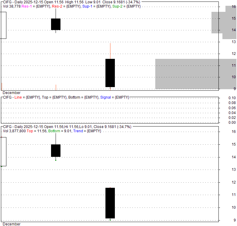 Price has closed below its short-term moving average. Short-term moving average is currently below mid-term; and below long-term moving average. From the relationship between price and moving averages: This stock is NEUTRAL in short-term; and NEUTRAL in mid-long term.[ CIFG ] has closed Bollinger Bands are 0% narrower than normal.