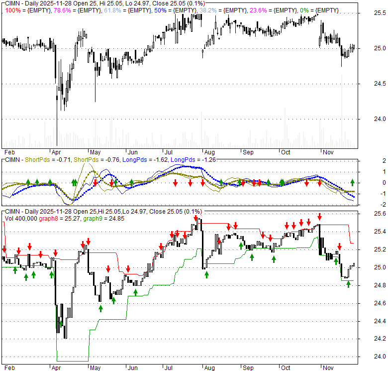 Price has closed above its short-term moving average. Short-term moving average is currently below mid-term; and below long-term moving average. From the relationship between price and moving averages: This stock is NEUTRAL in short-term; and BEARISH in mid-long term.[ CIMN ] has closed below upper band by 46.9%. Bollinger Bands are 18.6% wider than normal. The current width of the bands does not suggest anything about the future direction or movement of prices.