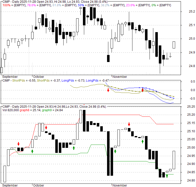 Price has closed above its short-term moving average. Short-term moving average is currently below mid-term; and below long-term moving average. From the relationship between price and moving averages: This stock is NEUTRAL in short-term; and NEUTRAL in mid-long term.[ CIMP ] has closed below upper band by 48.9%. Bollinger Bands are 0% narrower than normal.