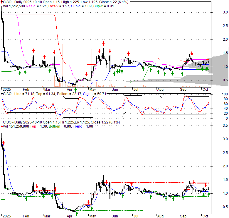Price has closed above its short-term moving average. Short-term moving average is currently above mid-term; and above long-term moving average. From the relationship between price and moving averages: This stock is BULLISH in short-term; and NEUTRAL in mid-long term.[ CISO ] has closed It is unclear right now based on current values. 49.6% narrower than normal. The narrow width of the bands suggests low volatility as compared to its normal range. The bands have been in this narrow range for 2 bars. This is a sign that the market may be about to initiate a new trend.