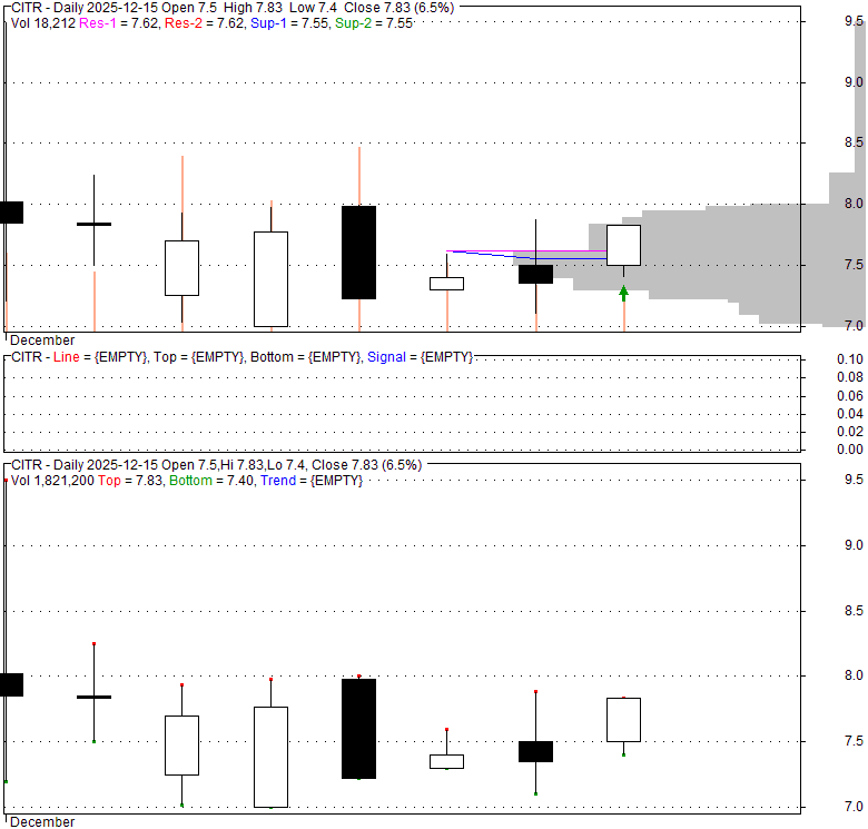 Price has closed above its short-term moving average. Short-term moving average is currently below mid-term; and below long-term moving average. From the relationship between price and moving averages: This stock is NEUTRAL in short-term; and NEUTRAL in mid-long term.[ CITR ] has closed Bollinger Bands are 0% narrower than normal.