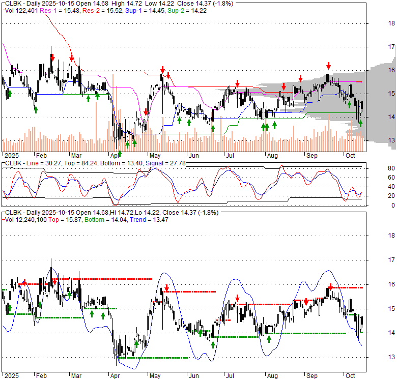 Price has closed above its short-term moving average. Short-term moving average is currently below mid-term; and below long-term moving average. From the relationship between price and moving averages: This stock is NEUTRAL in short-term; and NEUTRAL in mid-long term.[ CLBK ] has closed above bottom band by 25.0%. Bollinger Bands are 40.2% wider than normal. The large width of the bands suggest high volatility as compared to its normal range. The bands have been in this wide range for 2 days. This is a sign that the current trend might continue.