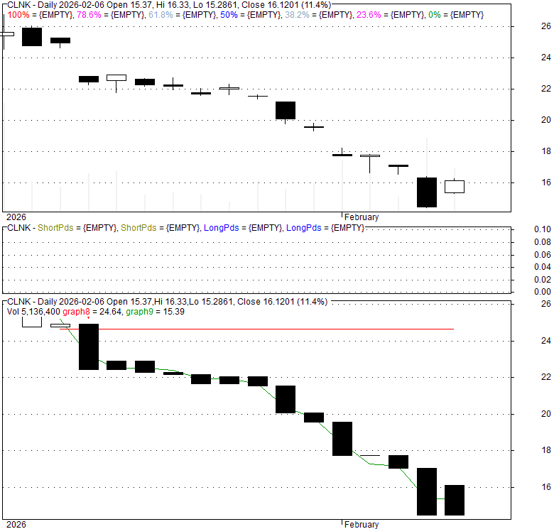 Price has closed below its short-term moving average. Short-term moving average is currently below mid-term; and below long-term moving average. From the relationship between price and moving averages: This stock is NEUTRAL in short-term; and NEUTRAL in mid-long term.[ CLNK ] has closed above bottom band by 14.4%. Bollinger Bands are 0% narrower than normal.