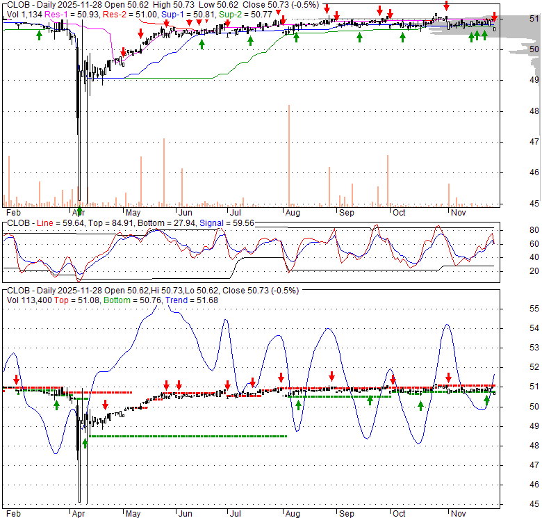 Price has closed below its short-term moving average. Short-term moving average is currently above mid-term; and above long-term moving average. From the relationship between price and moving averages: This stock is NEUTRAL in short-term; and BULLISH in mid-long term.[ CLOB ] has closed above bottom band by 6.4%. Bollinger Bands are 0.8% narrower than normal. The current width of the bands does not suggest anything about the future direction or movement of prices.