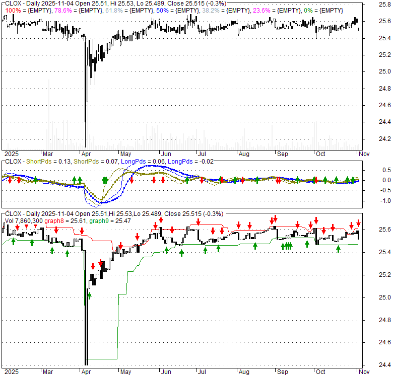 Price has closed below its short-term moving average. Short-term moving average is currently above mid-term; and above long-term moving average. From the relationship between price and moving averages: This stock is NEUTRAL in short-term; and NEUTRAL in mid-long term.[ CLOX ] has closed above bottom band by 29.3%. Bollinger Bands are 5.7% narrower than normal. The current width of the bands does not suggest anything about the future direction or movement of prices.