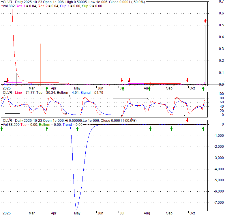 Price has closed below its short-term moving average. Short-term moving average is currently below mid-term; and below long-term moving average. From the relationship between price and moving averages: This stock is BEARISH in short-term; and BEARISH in mid-long term.[ CLVR ] has closed above bottom band by 40.2%. Bollinger Bands are 96.5% narrower than normal. The narrow width of the bands suggests low volatility as compared to its normal range. The bands have been in this narrow range for 58 bars. This is a sign that the market may be about to initiate a new trend.