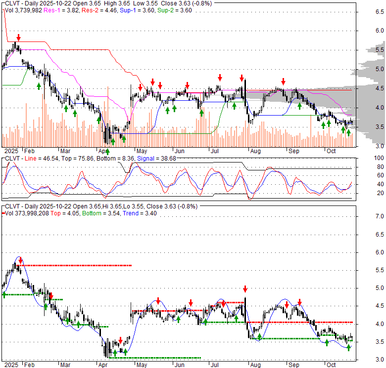 Price has closed above its short-term moving average. Short-term moving average is currently below mid-term; and below long-term moving average. From the relationship between price and moving averages: This stock is NEUTRAL in short-term; and BEARISH in mid-long term.[ CLVT ] has closed above bottom band by 38.5%. Bollinger Bands are 39.5% narrower than normal. The current width of the bands does not suggest anything about the future direction or movement of prices.