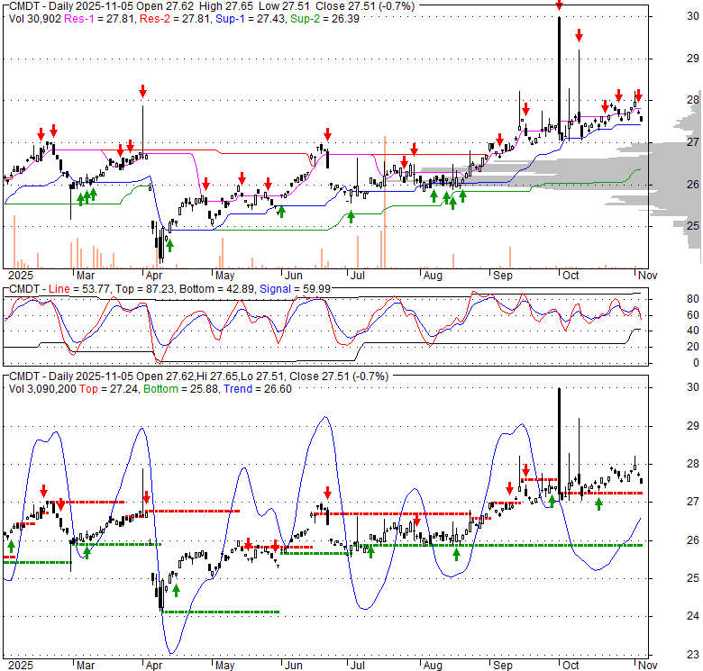 Price has closed below its short-term moving average. Short-term moving average is currently above mid-term; and above long-term moving average. From the relationship between price and moving averages: This stock is NEUTRAL in short-term; and BULLISH in mid-long term.[ CMDT ] has closed above bottom band by 25.4%. Bollinger Bands are 30% narrower than normal. The current width of the bands does not suggest anything about the future direction or movement of prices.